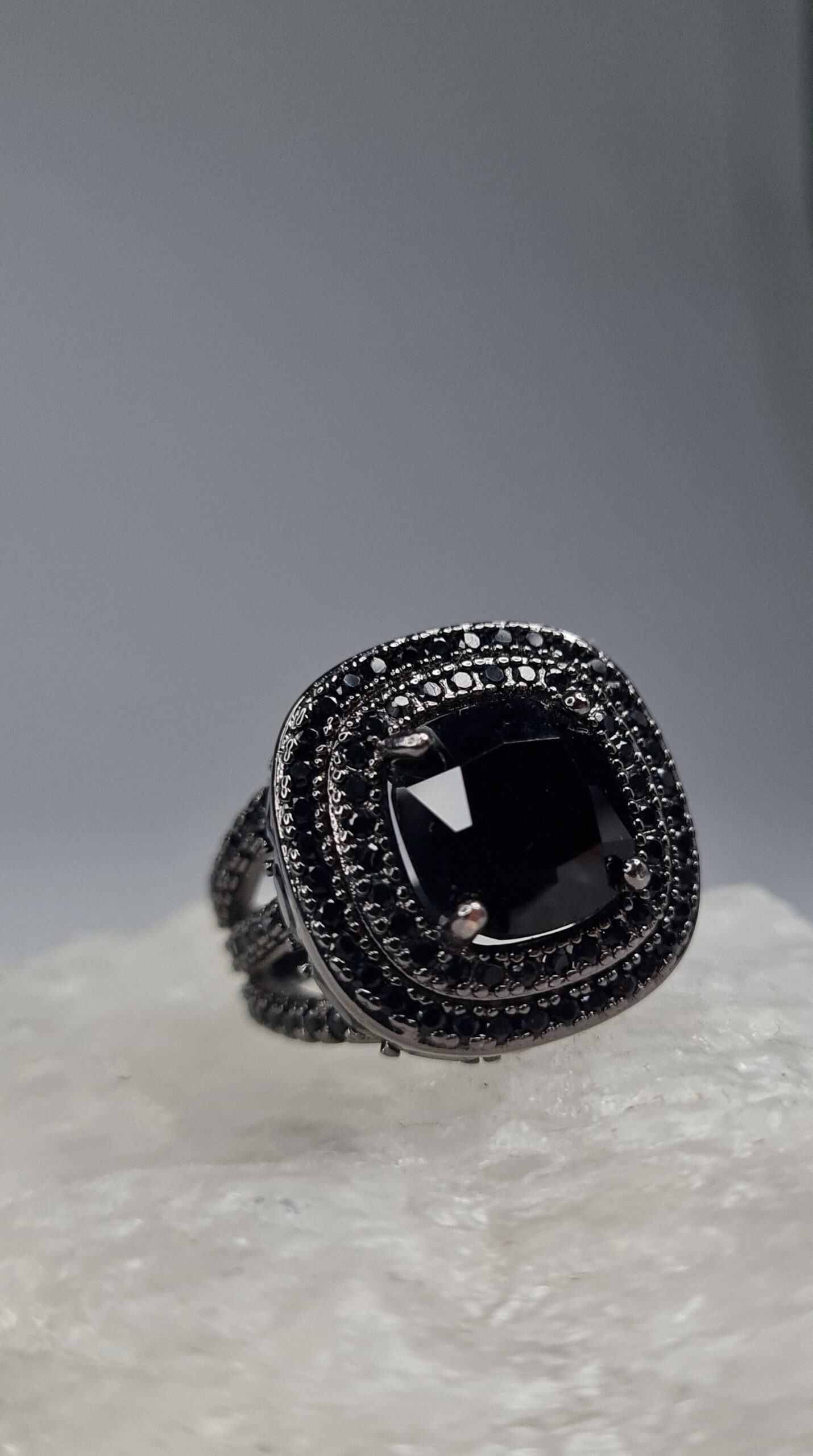 The Obsidian Throne ring is an ode to strength in darkness. A deep black gemstone sits like a crown atop a vintage-inspired setting, framed by detailed gothic metalwork. This ring is perfect for those who rule in silence and power.