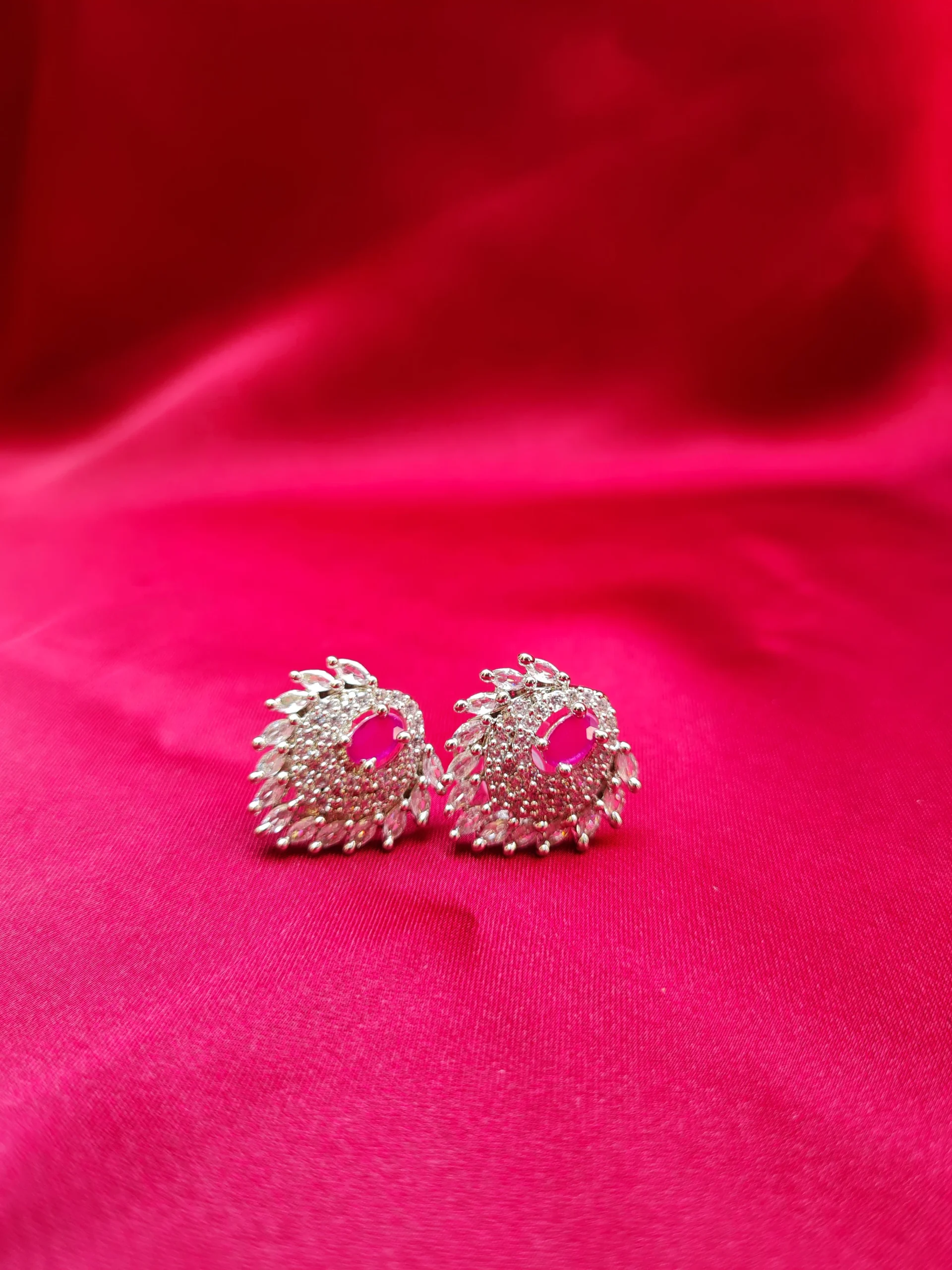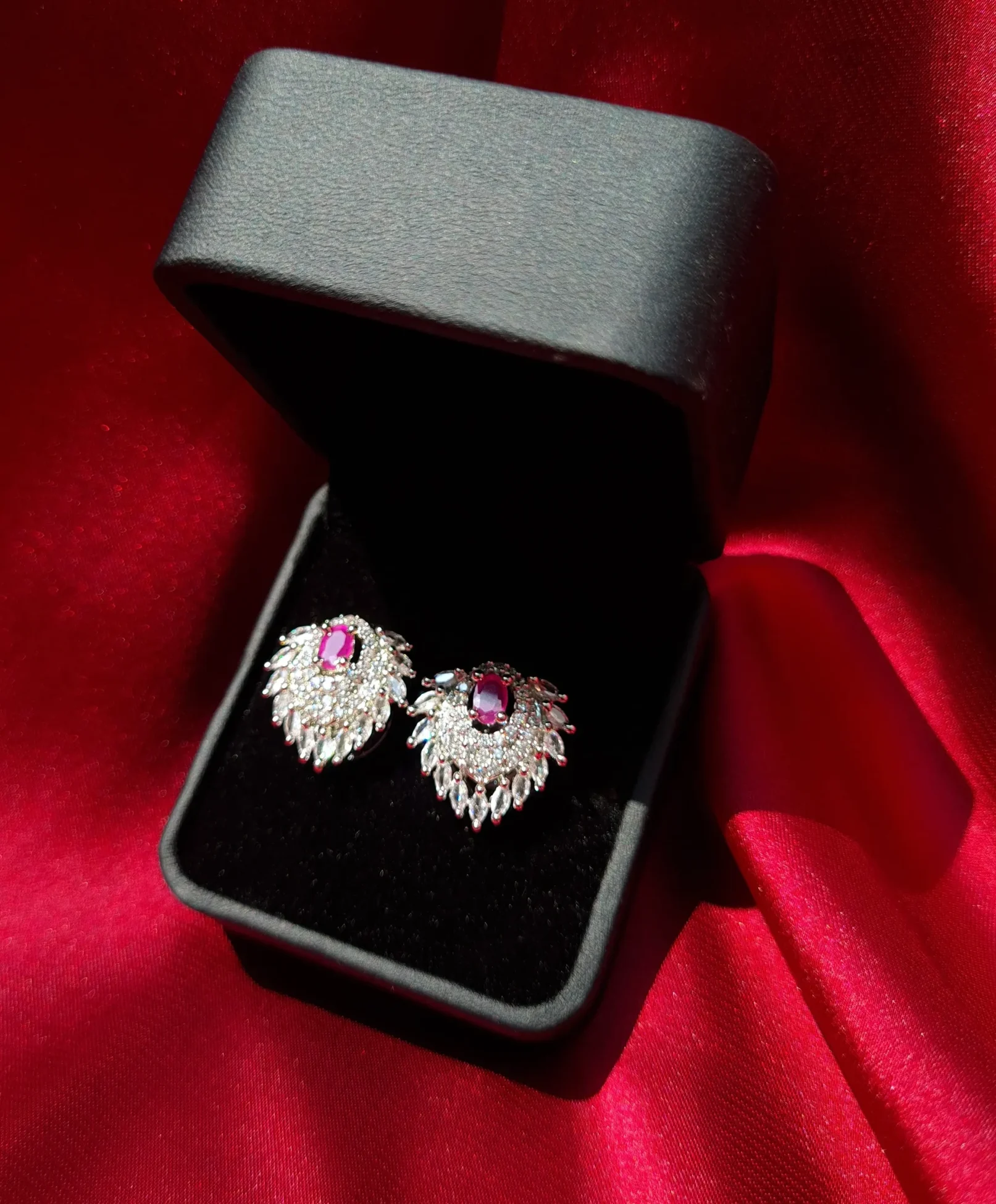 Elegant earrings with a radiant ruby center, encircled by sparkling white crystal stone in a unique swirl, design a perfect blend of luxury and timeless charm.